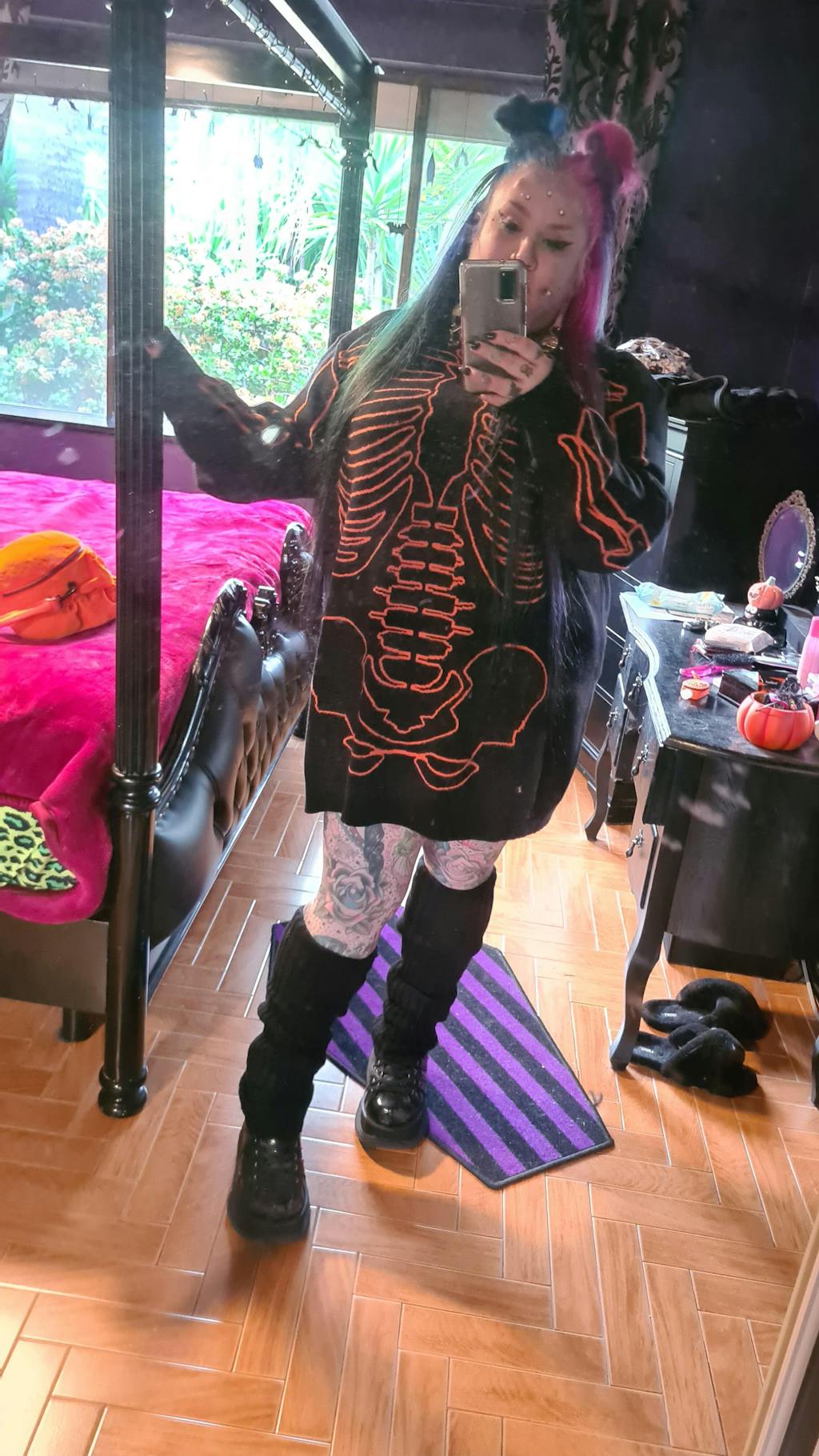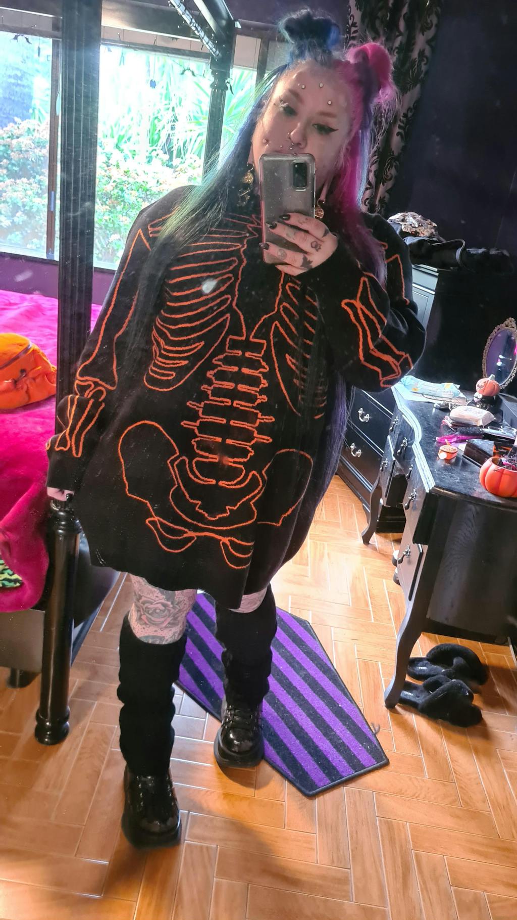 This black sweater features a distinctive orange skeleton design on the front and back, offering frightful flair throughout the year.