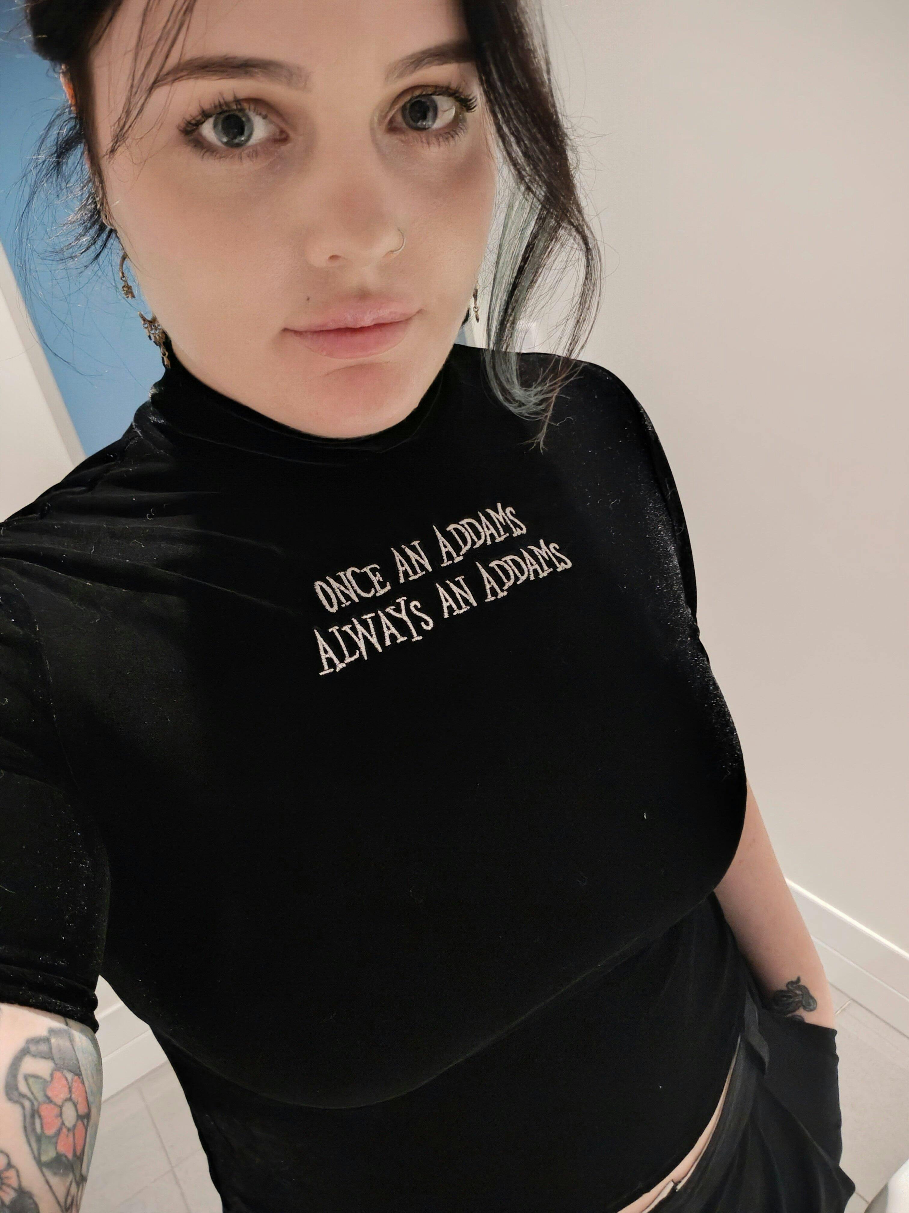 - Embroidered slogan which reads "Once an Addams always an Addams".