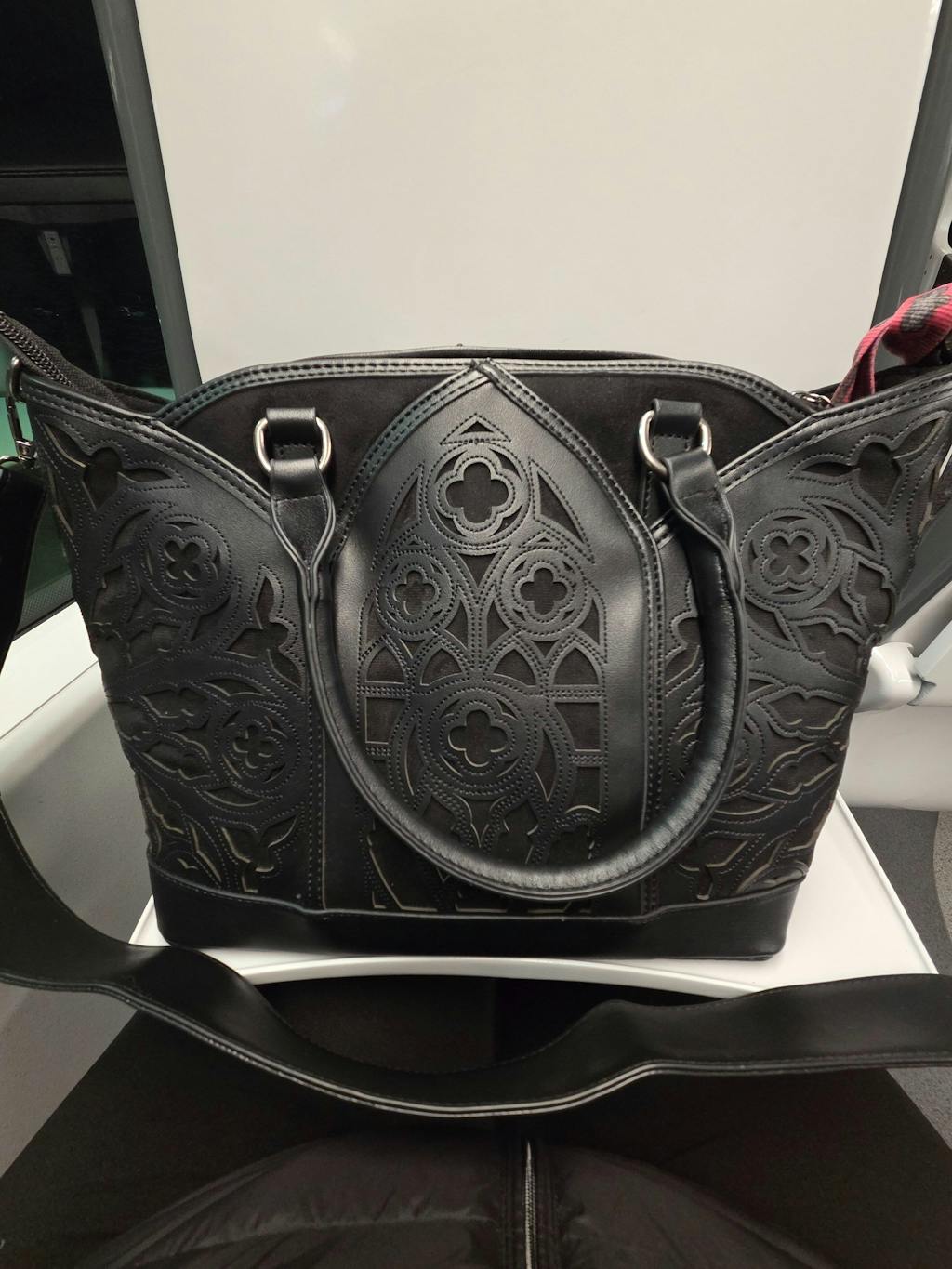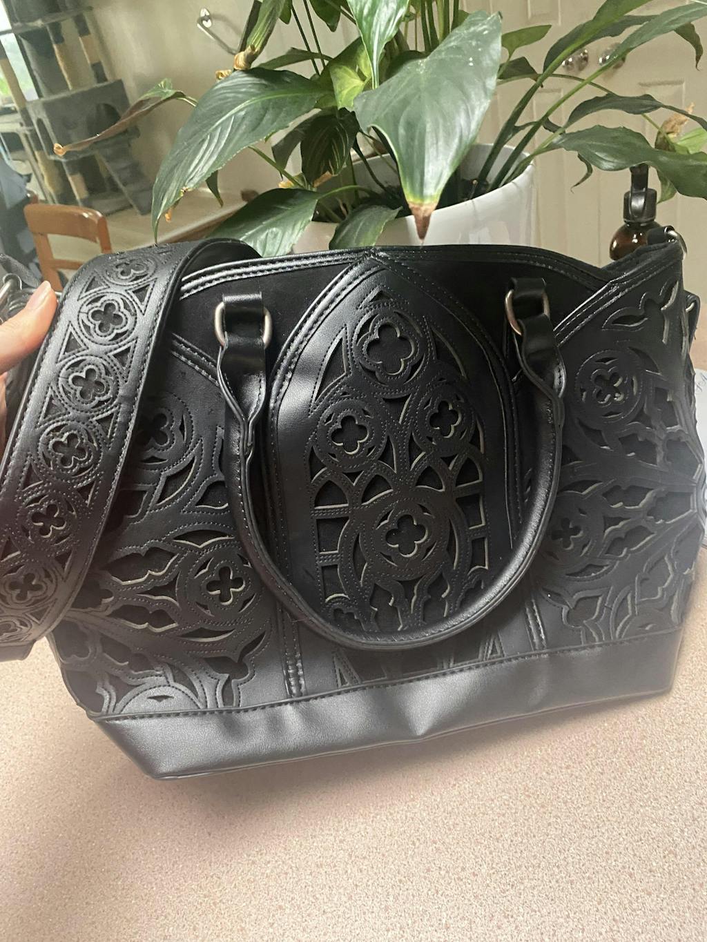 - Laser-cut cathedral gothic architecture design on body and shoulder strap