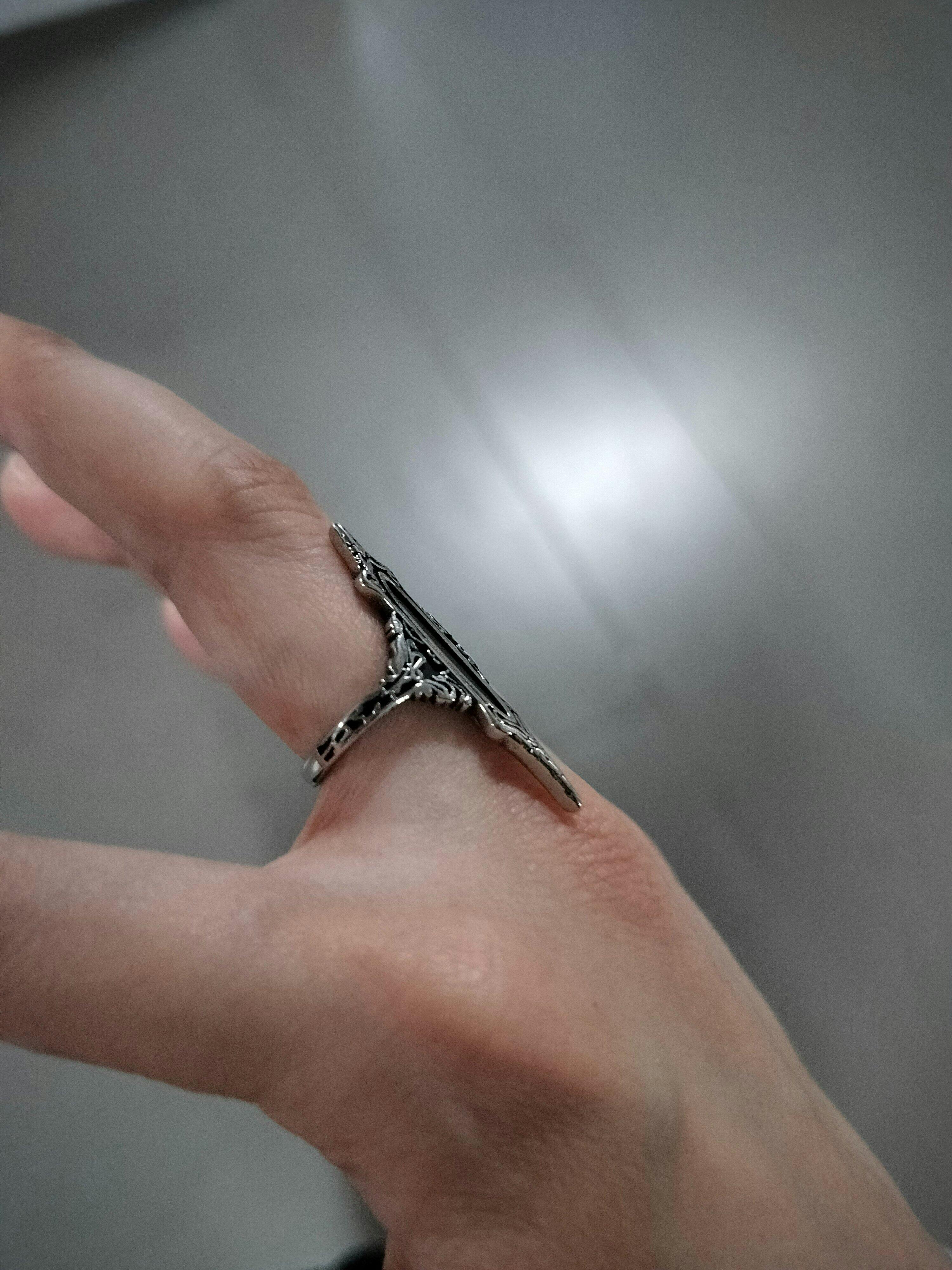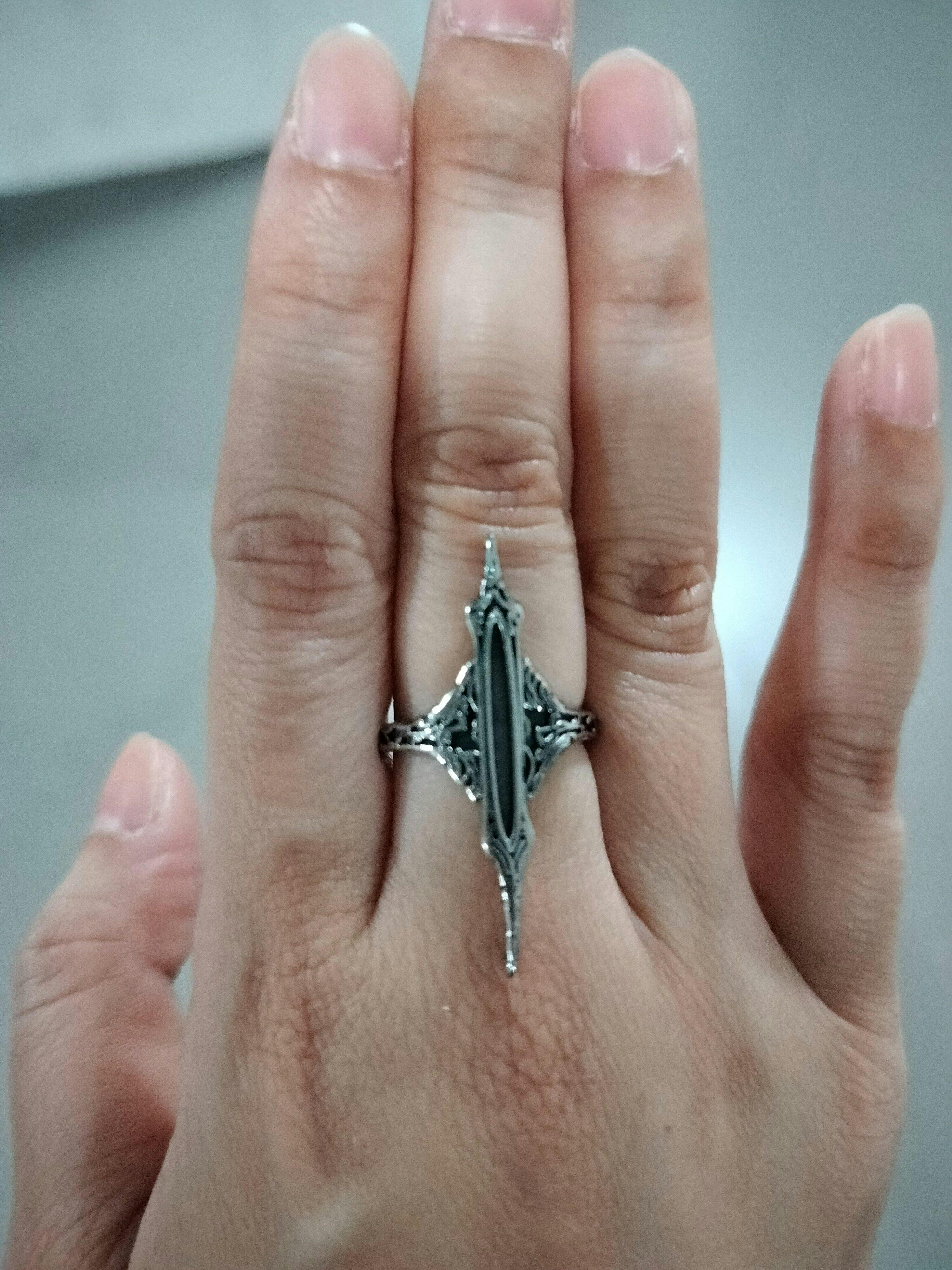 🖤 The band itself is a testament to the bold and dramatic aesthetic of the period, featuring arch-like motifs reminiscent of cathedral windows. Each arch is meticulously crafted, adding a touch of dark elegance to the overall design.