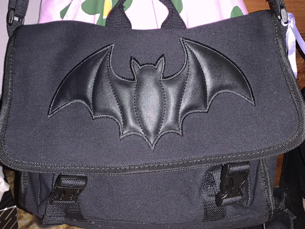 Your bag needs a subtle 3D bat pal, to keep your belongings safe. This black messenger style bag is big enough for your books or laptop, making it the ideal alternative work, school or uni bag.