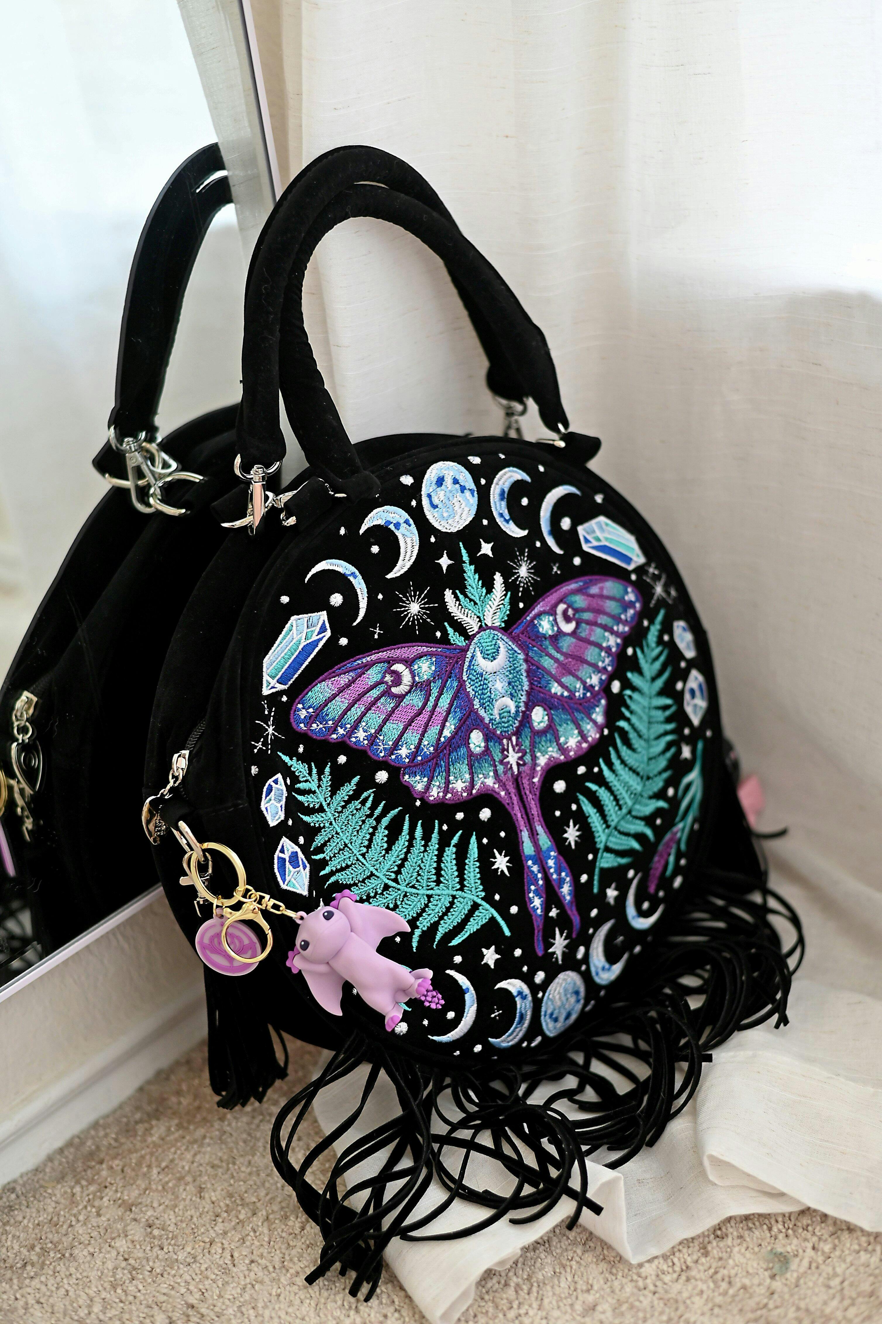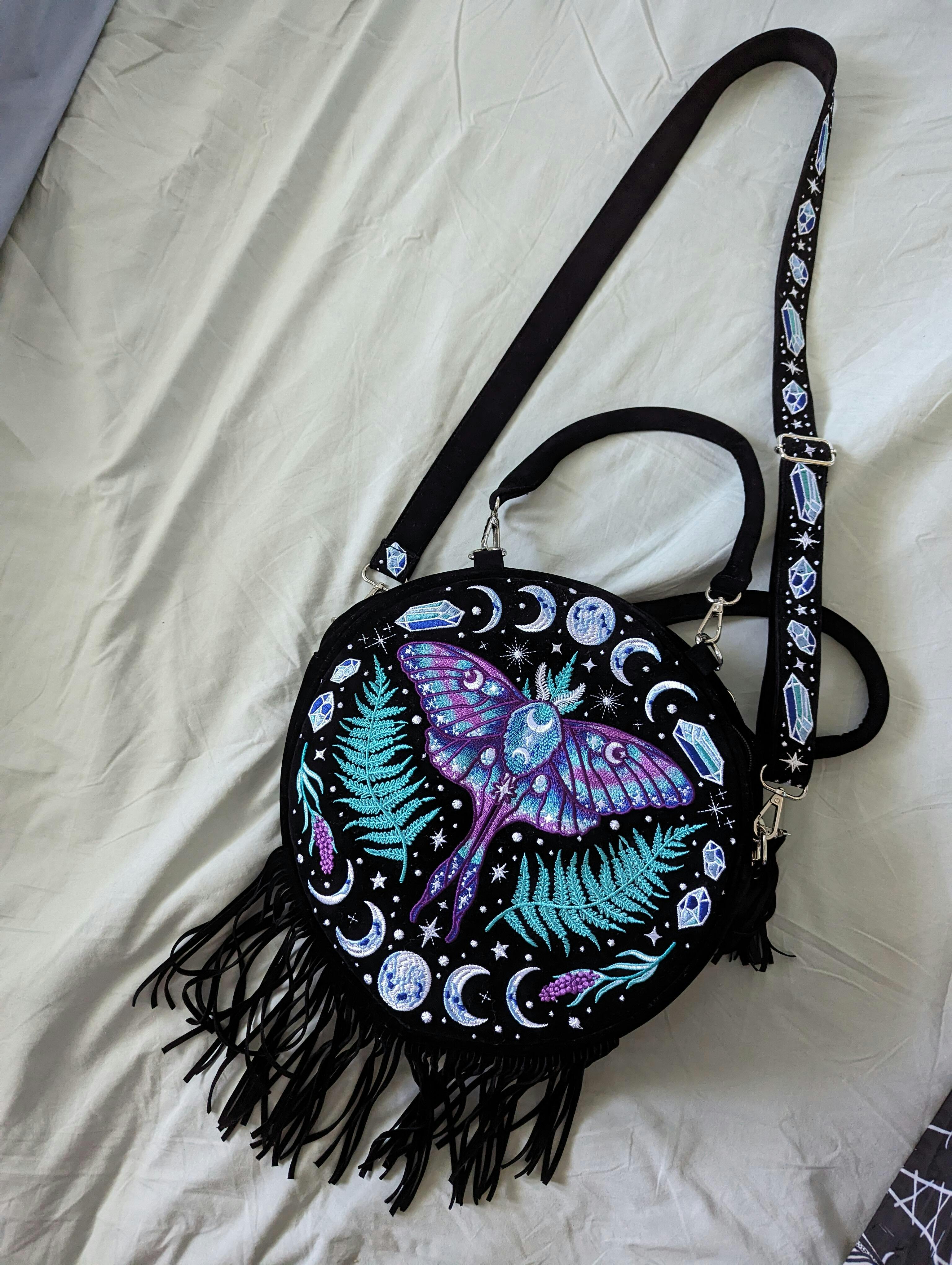 Step into a magical world and explore the mystical forest with us on this nocturnal adventure. Immerse yourself in the captivating beauty and secrets of nature's hidden wonders. And don't forget to bring along this uniquely designed enchanted forest round bag, a perfect companion for any fairy-tale expedition! The intricate embroidery on this bag glistens like magic, with a symmetrical design that evokes the perfect balance of nature. A radiant moth rests upon delicate fern leaves at the center, surrounded by shimmering crystal embellishments, moon phases, and stars inspired by the breathtaking Northern Lights.