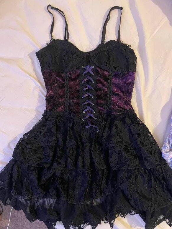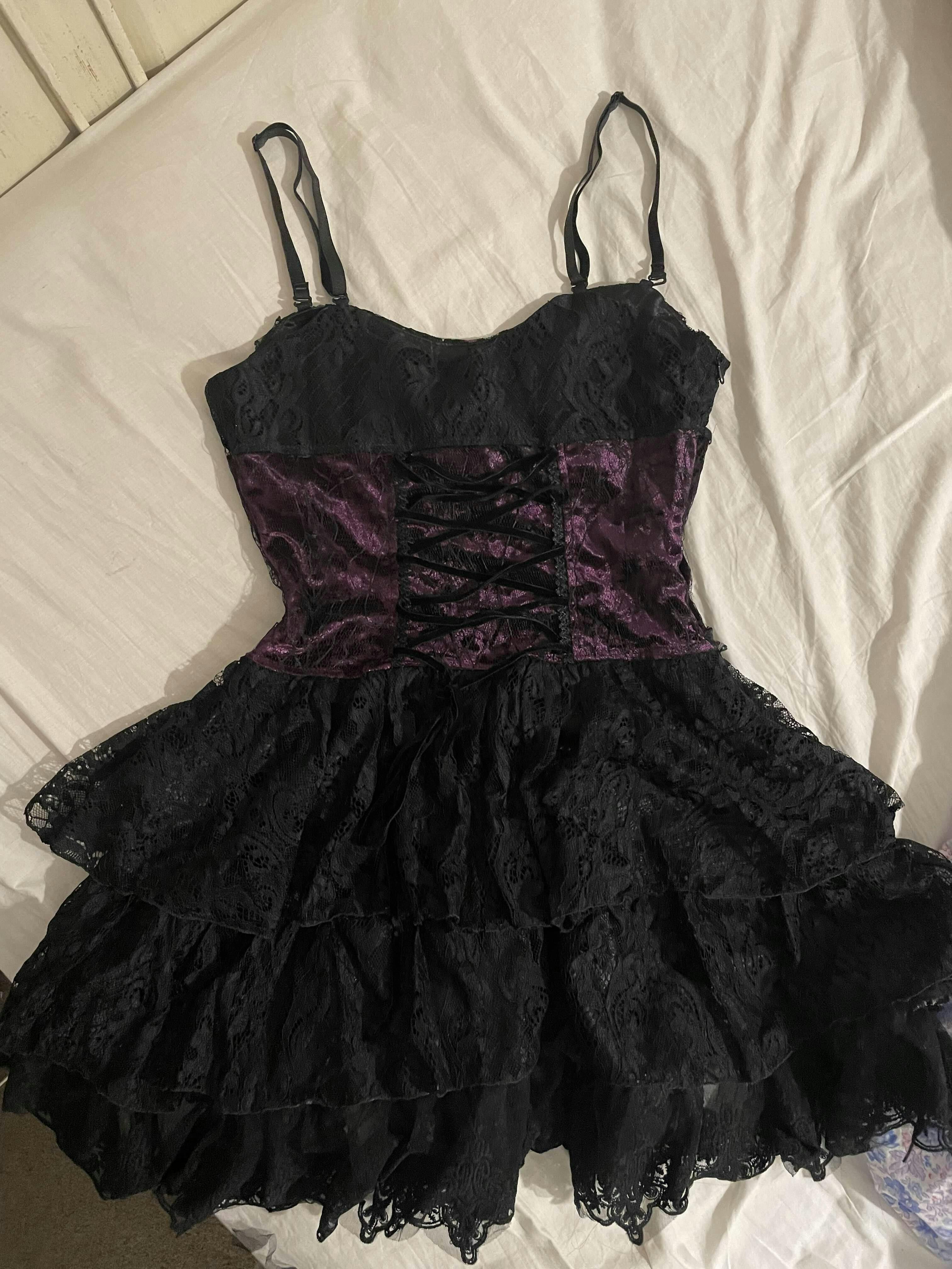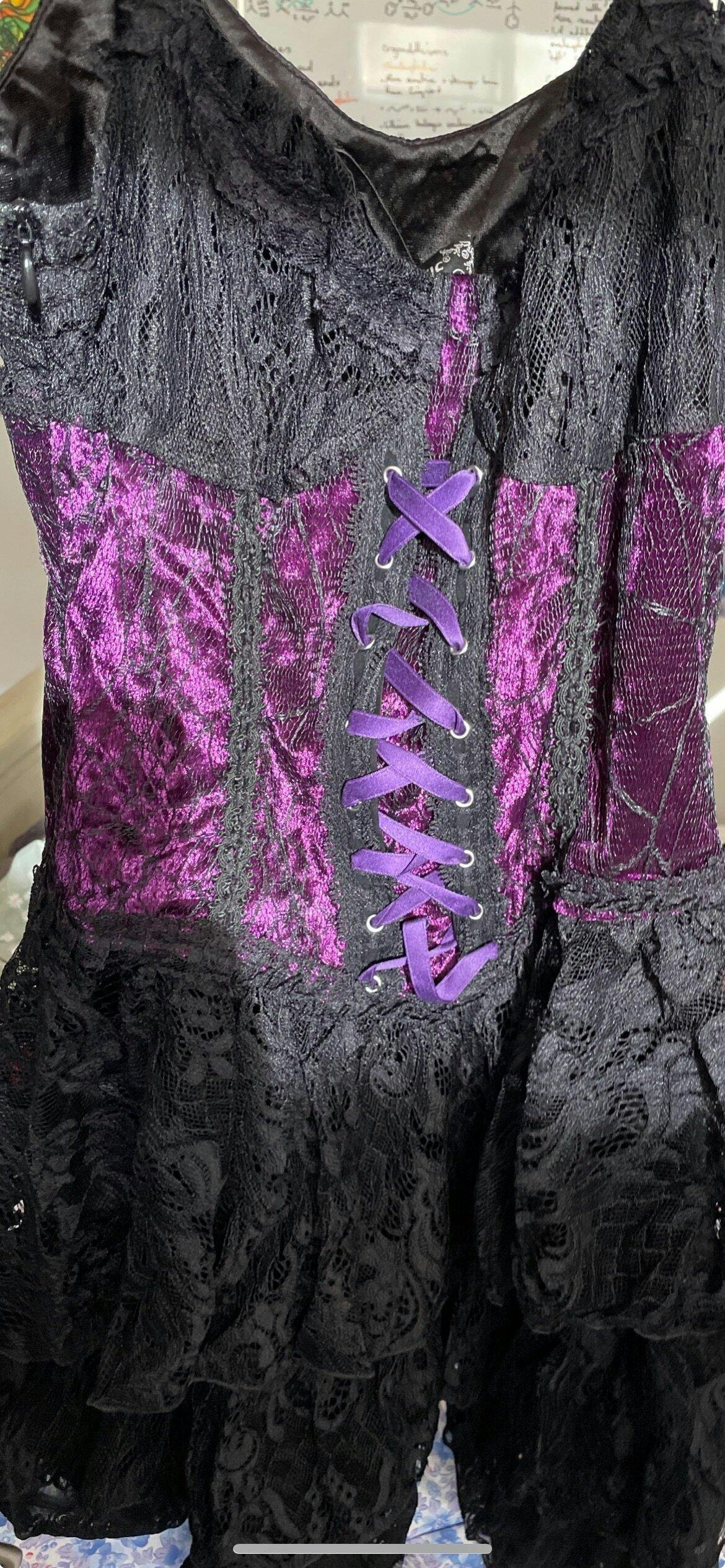 Introducing Dark in Love's Gothic lace up Corset Dress! A luxurious pairing of deep purple and black fabric, this exquisite corset dress features a lace up, corset detailing on the bodice and a layered lace skirt, perfect for any occasion you desire! As well as adjustable straps to ensure the perfect fit!
