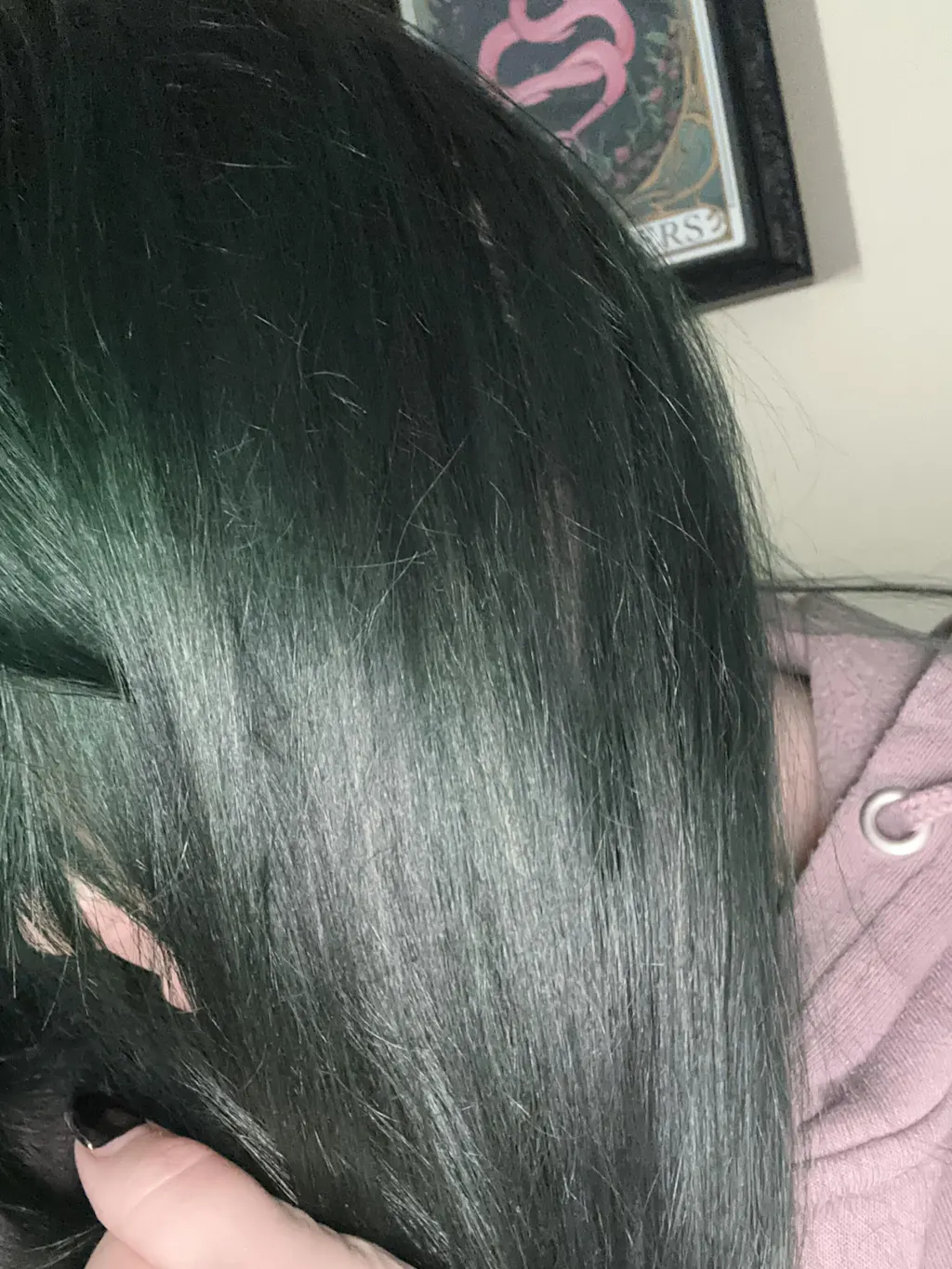 Juniper Green is a one-of-a-kind dark green hair dye with black undertones.