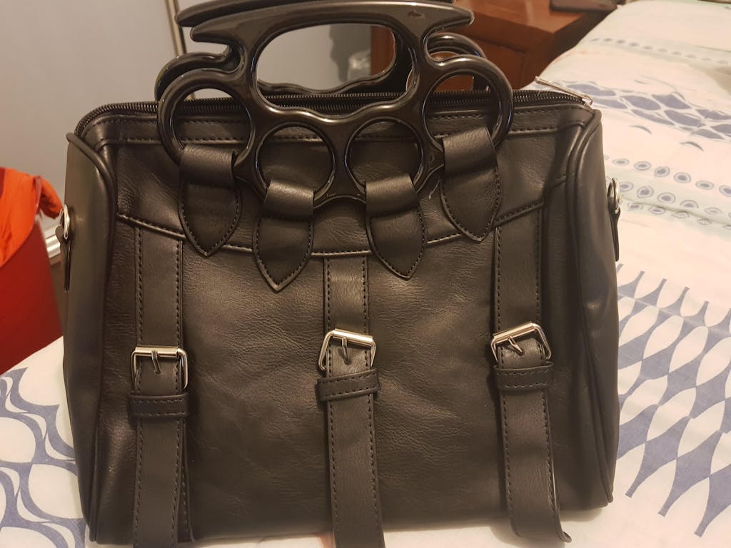 This black textured PVC bag screams warning. After all, it's knuckle duster handle is lethal!