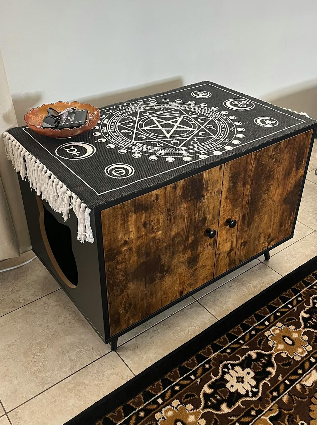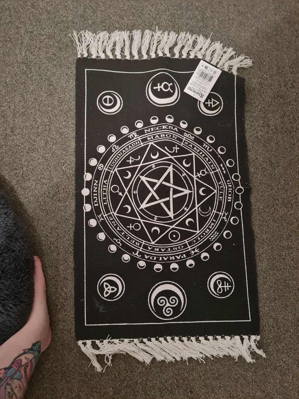 A beautiful hand woven, tasselled wiccan inspired rug. Featuring symbols of wiccan festivals, elements and moon phases!