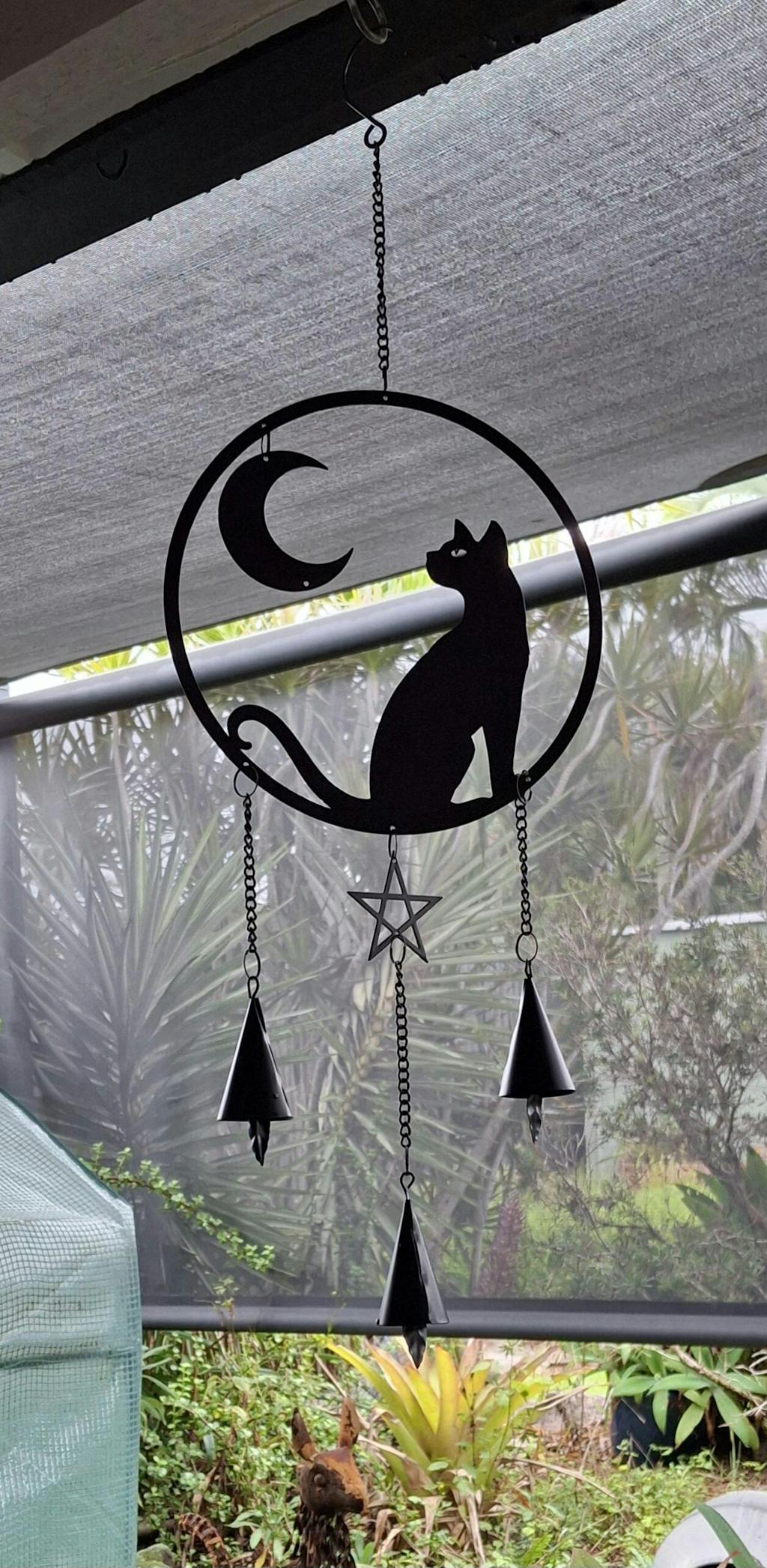 The iconic Alchemy black cat and moon design creates this stunning noise making wind chime.