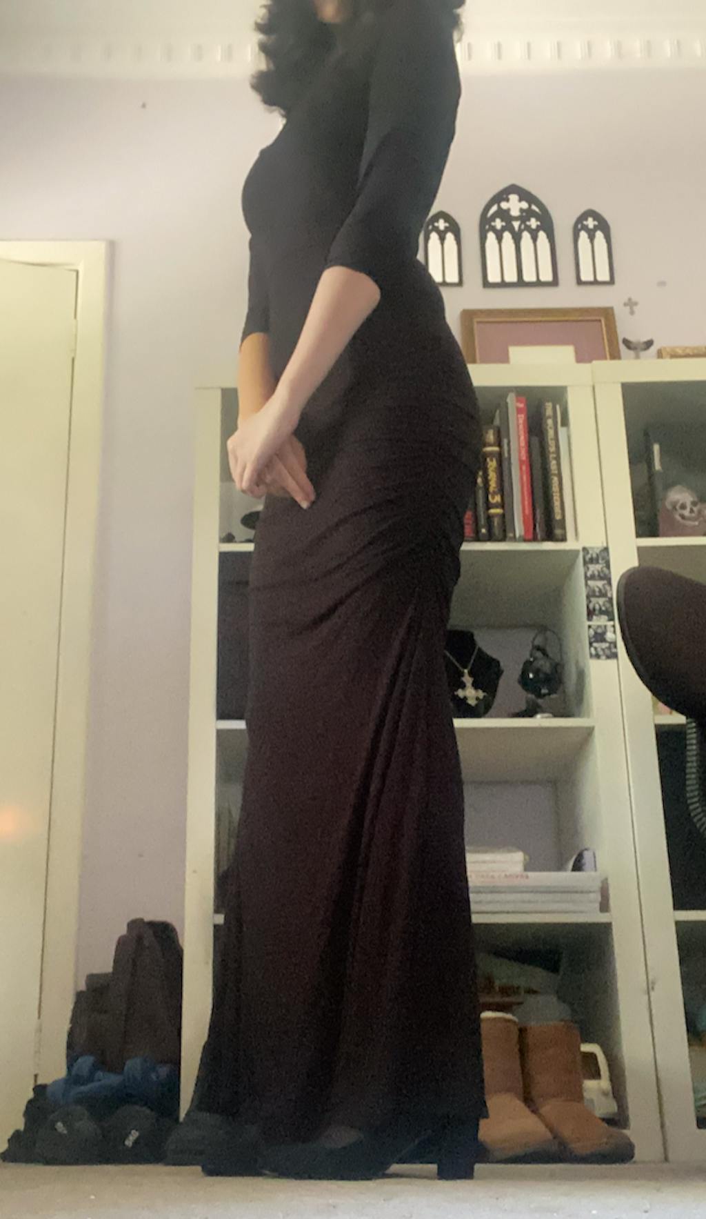 A black long sleeve maxi dress with thumb holes. This dress is fitted with gathered sides to give your waist and hips the most beautiful hourglass shape.