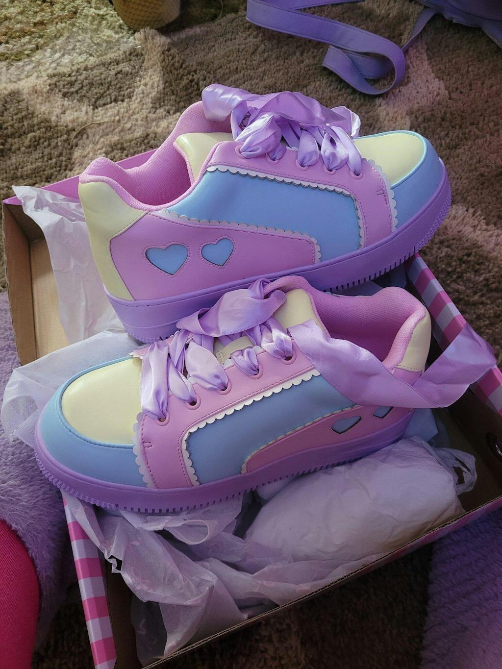 The perfect pastel colorblock sneakers finally exist!! Accented with scalloped trim detail and comes with two sets of laces: a soft satin ribbon lacing in lavender and a sturdy cord lacing in pink!