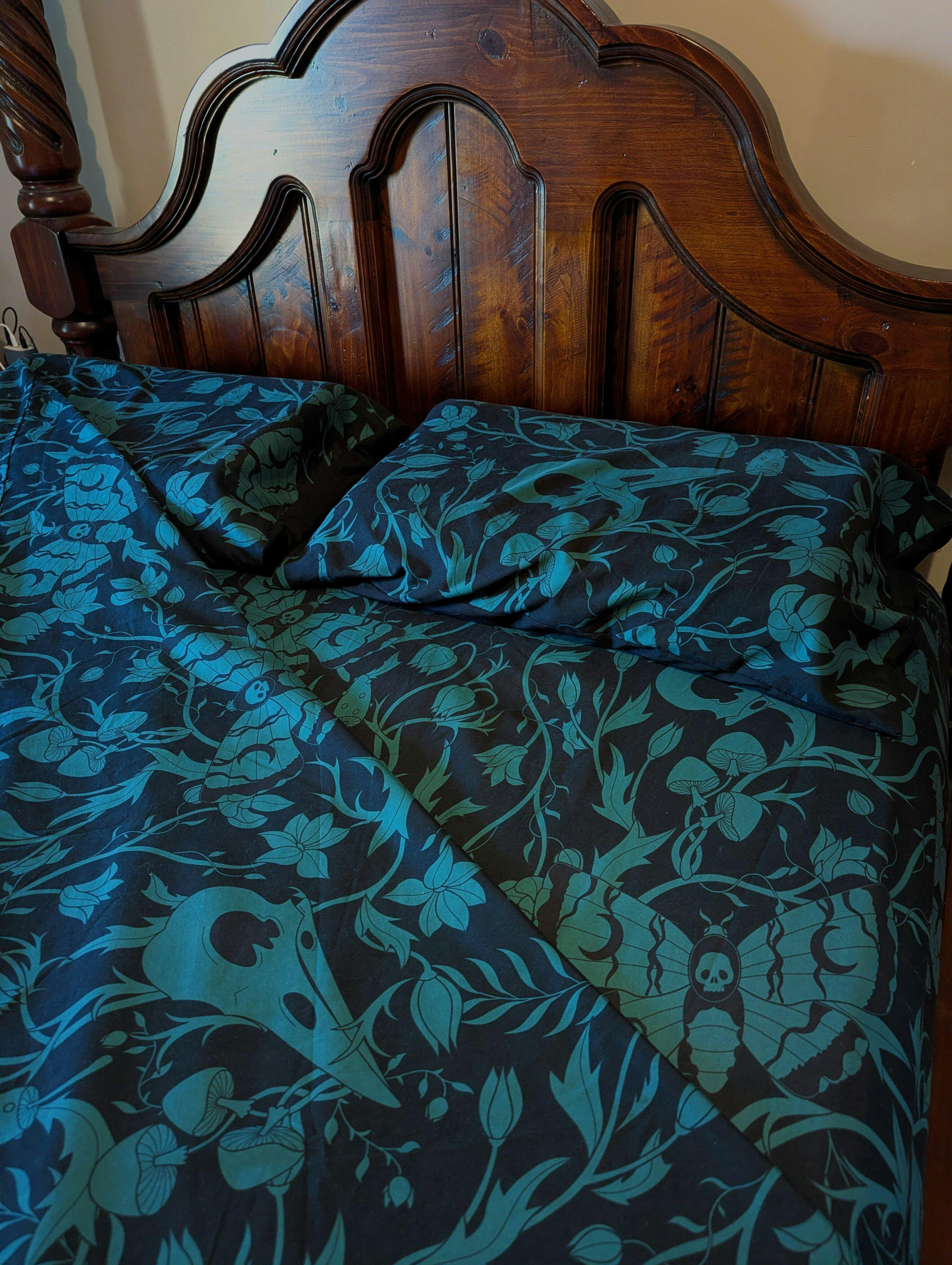The set includes a fitted sheet, a flat sheet and two pillowcases, each showcasing the intricate design. Perfect for those who seek to infuse their bedroom with gothic allure and a twist of nature, the Phantom Woods Green Sheet Set sets the stage for unforgettable dreams!