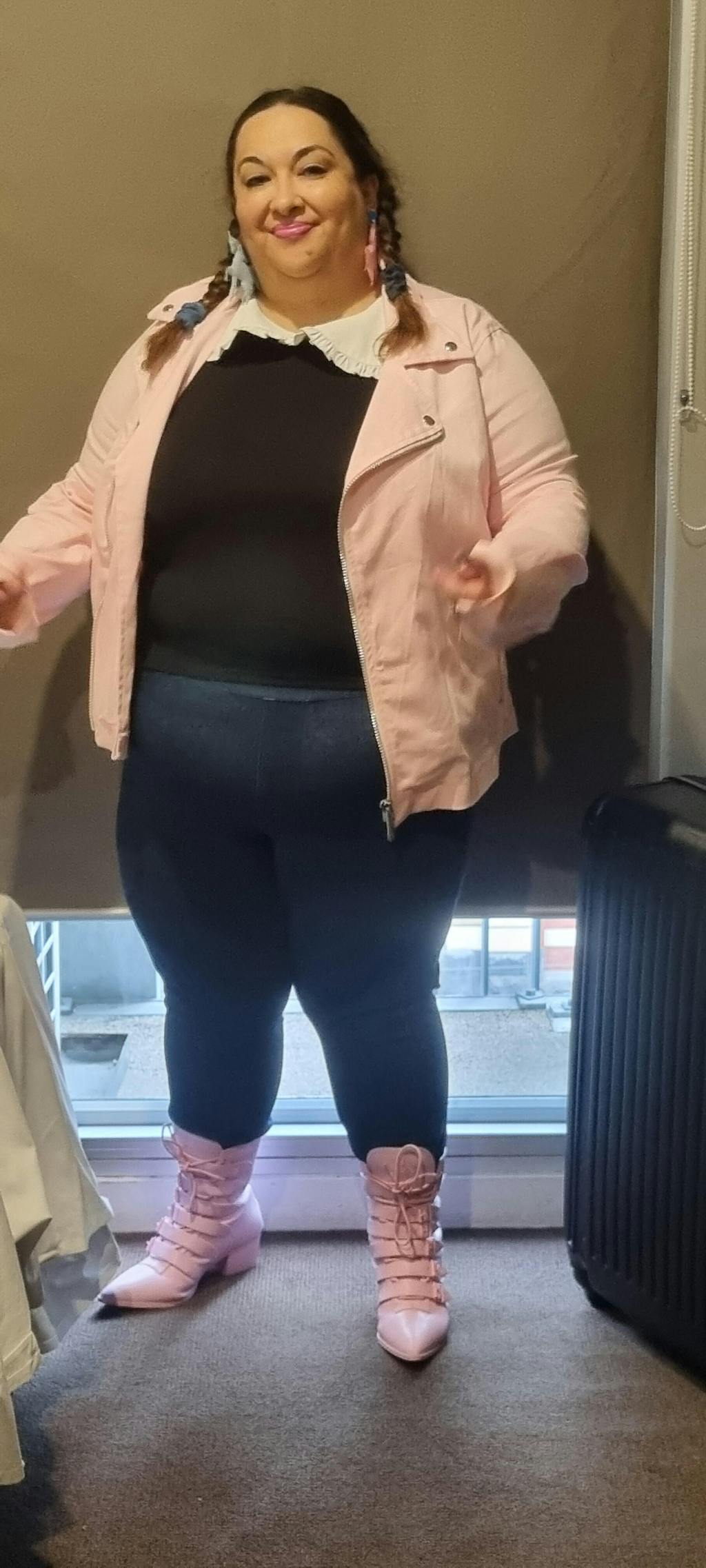 A slightly oversized stretch pink denim motorcycle jacket just begging for all your pins and patches. A perfect blank to customize to your personality.