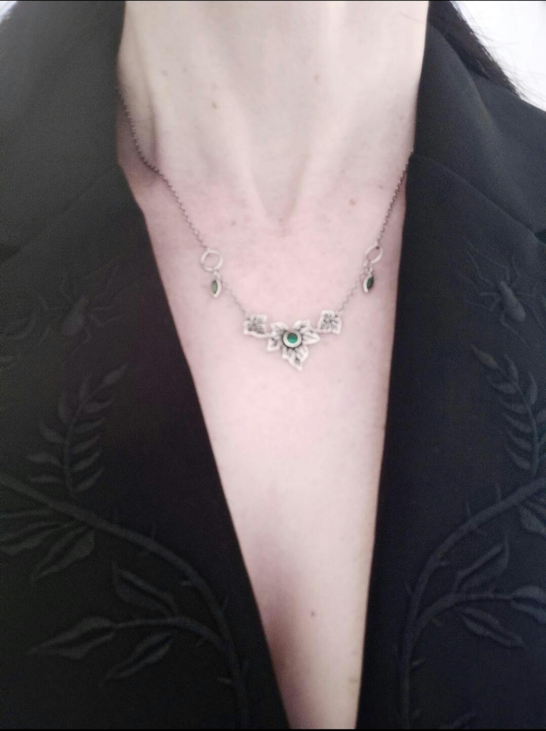 This medium-length ivy leaf necklace features intricate magical detailing with a subtle, enchanted feel. A large sculpted leaf pendant forms the centrepiece, set with a faceted emerald-green glass stone. Two matching marquise-shaped charms add balance and shimmer to the design ๐ค