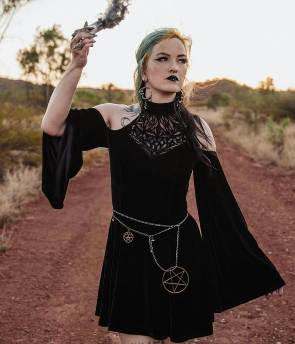 The sophisticated halter neck design comes complete with an adjustable velvet choker, allowing you to personalize your fit, while the cold-shoulder design adds a modern gothic twist. The long, floaty bell sleeves enhance the dress’s ethereal charm, adding dramatic movement to every step.