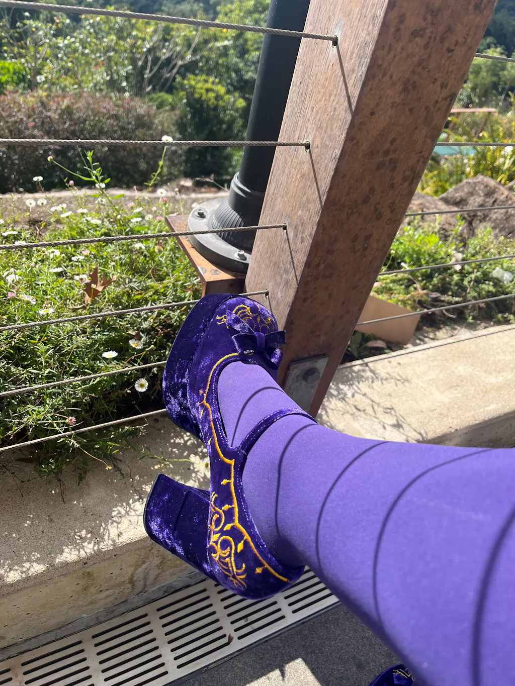 The Royal Manor Velvet Platform Heels are inspired by the grandeur of royalty, materials and looks once reserved for a select few, is now a canvas for which we can create upon. These statement heels bring together the richness of deep purple crushed velvet and the elegance of gold embroidery weaving a narrative of opulence from a forgotten age. The contrast of these colours are delightful indeed.