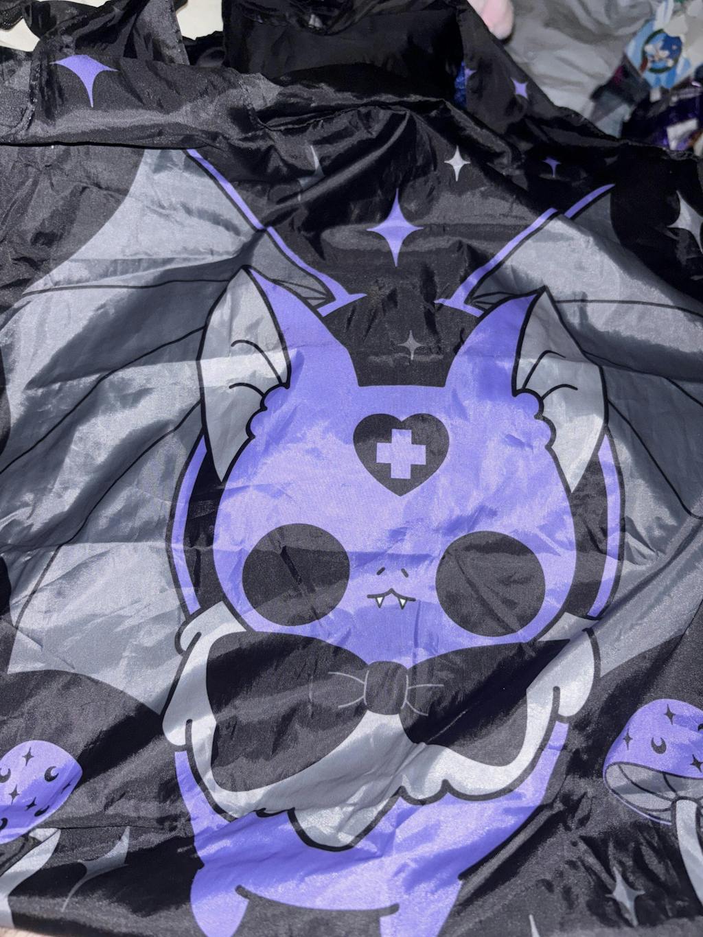 The design features an eye-catching combination of black and purple with a playful bat and eerie mushrooms. Whether you're going to the grocery store or carrying your everyday essentials, this tote bag is the perfect way to show off your love for all things dark and mysterious. Upgrade your fashion statement with this gothic tote bag from Beserk.