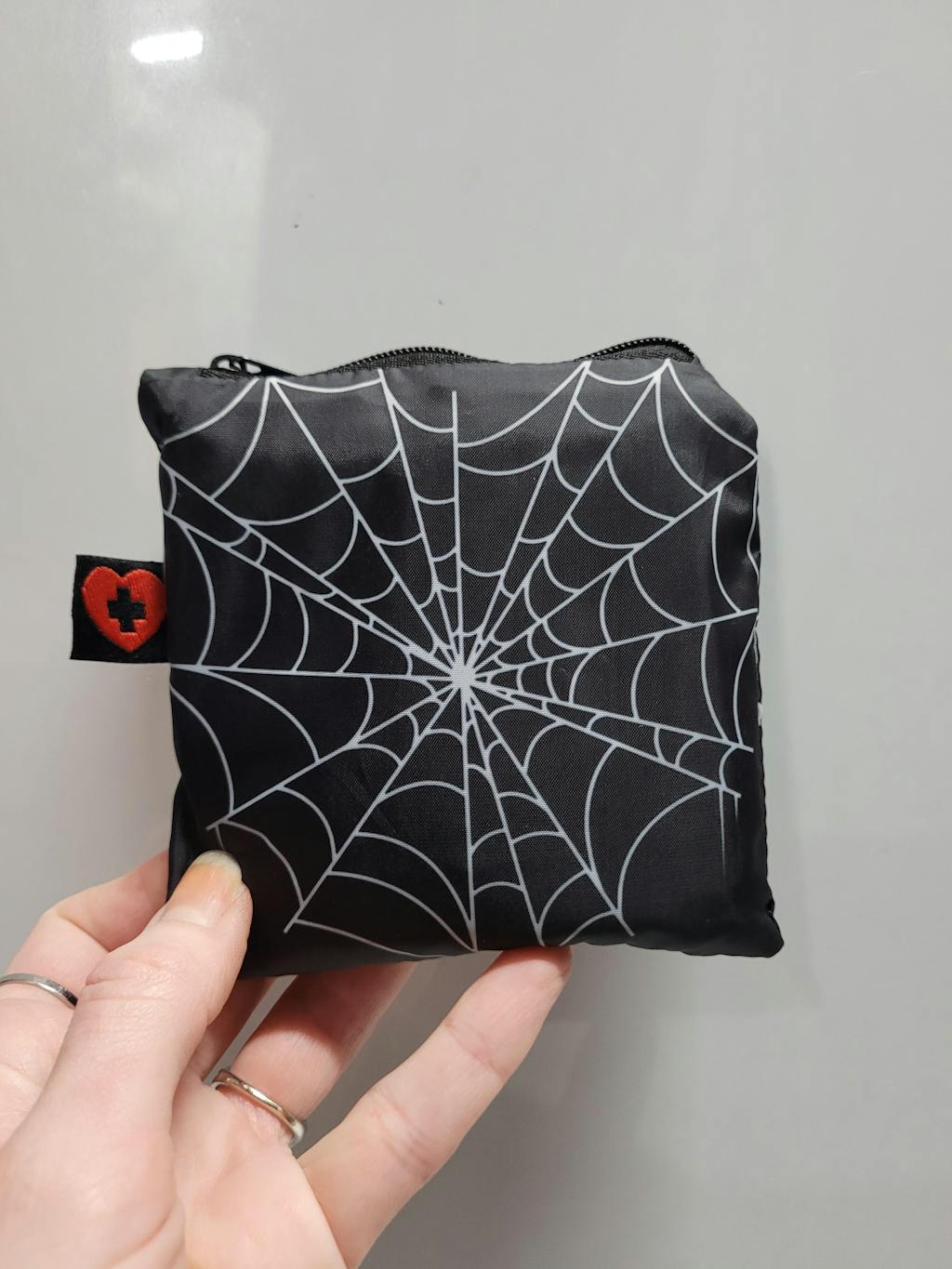 Introducing the must-have accessory for any goth on the go - the Spider Love Reusable Tote Bag from Beserk. Made with the environment in mind, this stylish and sturdy bag is the perfect alternative to single-use plastic bags. With its striking black and white design, it features a spiderweb in the shape of a heart, symbolizing the beauty in the darker things in life.