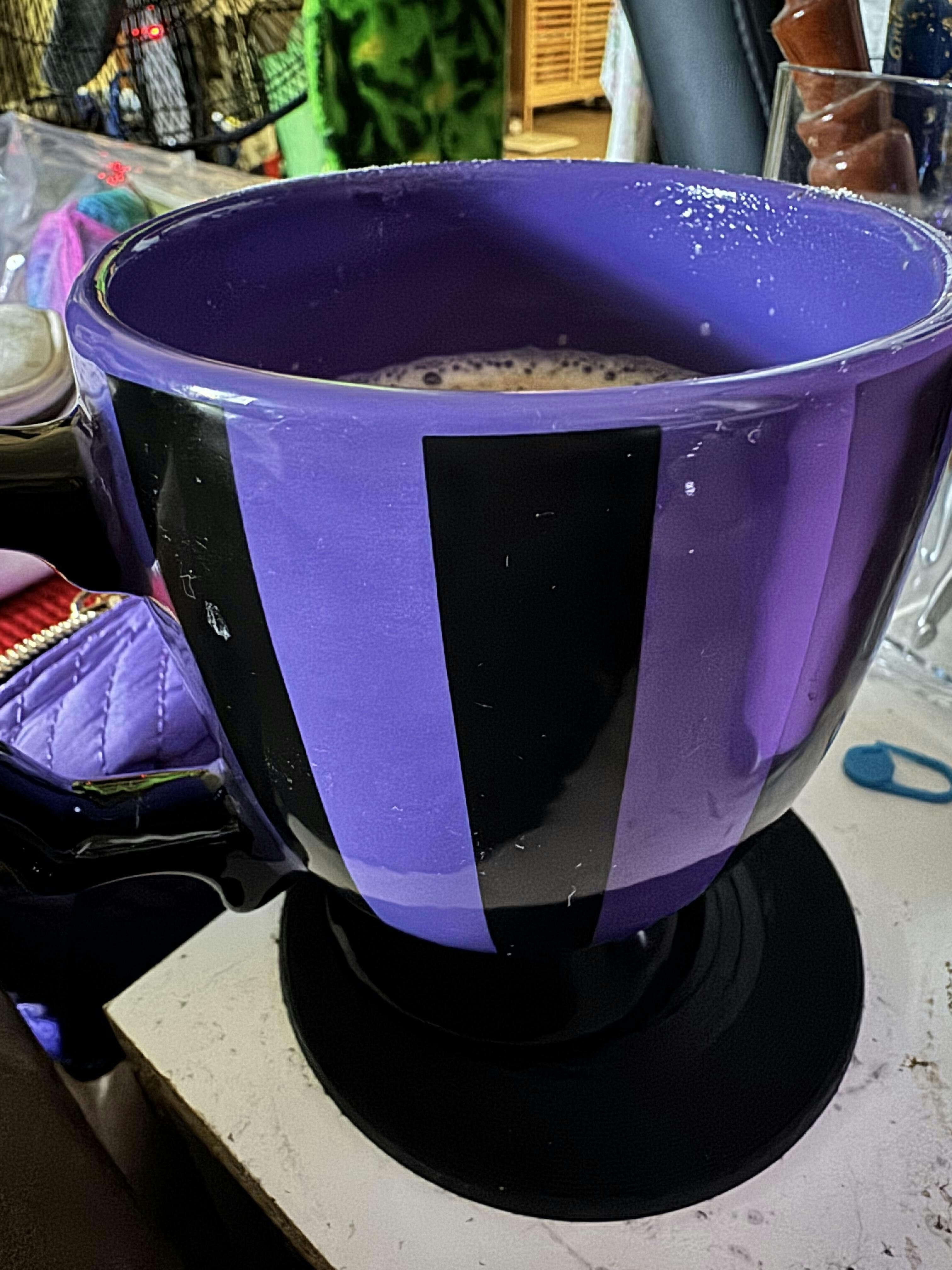 Elevate your tea ritual with this visually stunning purple teacup. Featuring bold black vertical stripes and a distinctive bat wing-shaped handle, it offers a unique and captivating aesthetic for those with a taste for the dramatic.