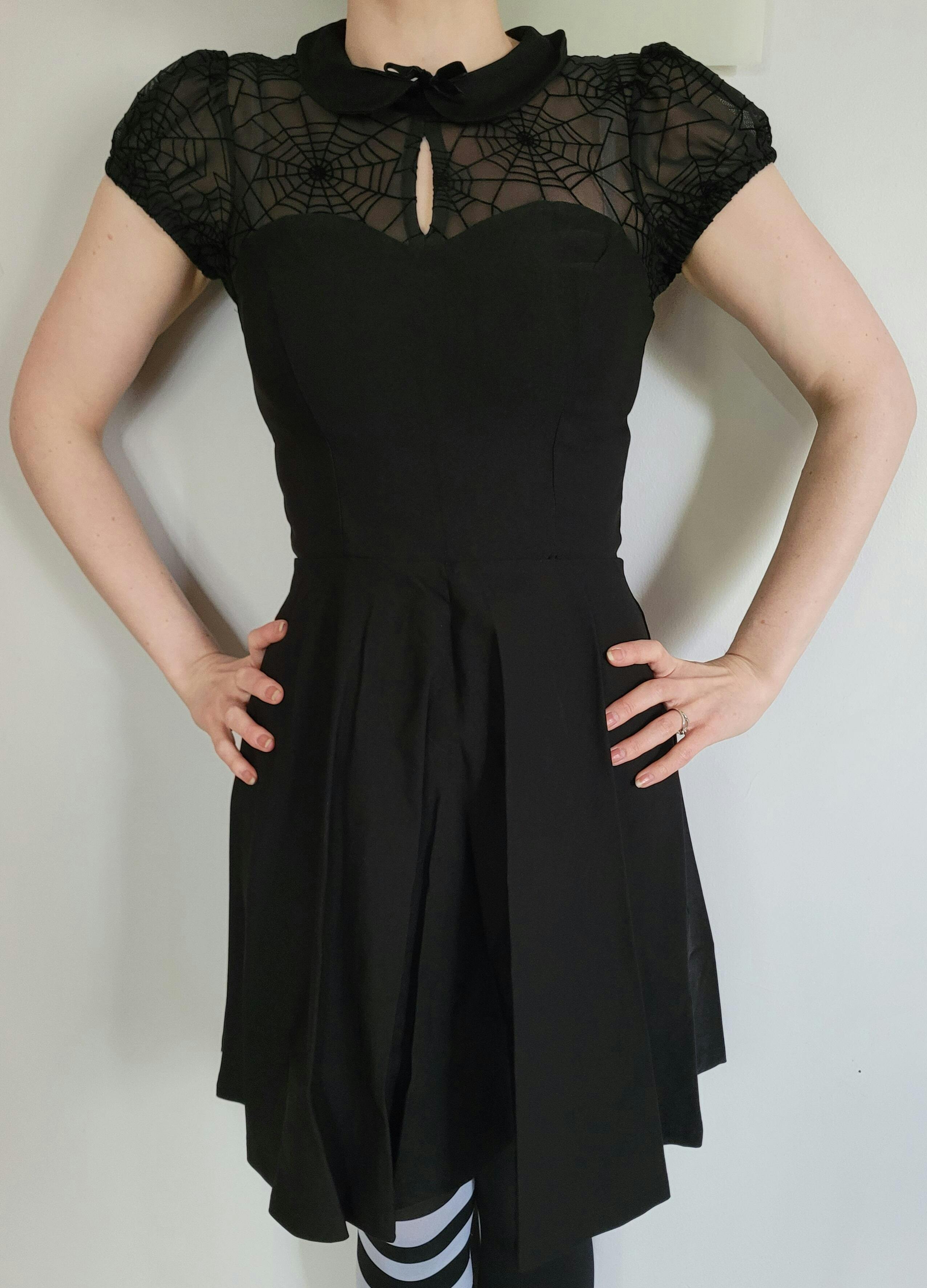 Unveil your gothic side with the Hell Bunny Viola Dress! This enchanting black mini dress is perfect for lovers of spooky, elegant fashion. Featuring delicate mesh fabric on the sleeves and chest, with velvet flocked spider webs, adding a dark, mysterious vibe to your look!
